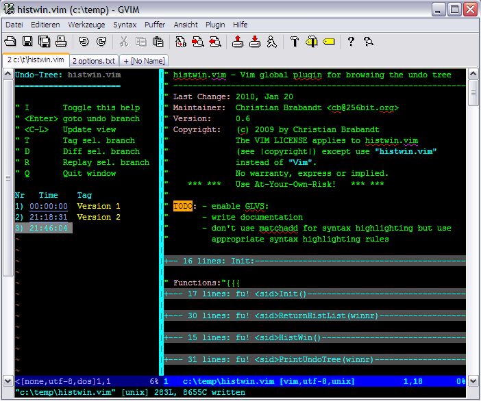 The Mundo plugin requires a Python installation and a Vim built with Python support. Mundo provides a graphical tree view of the entire undo tree, including the stored persistent undo data. Below the tree view is a contextual diff preview of each change made to make it much easier to find the exact state you are looking for. Although it does not provide some of the features of Histwin (like diffing to a specific state or tagging specific versions), the tree view and diff preview make it very easy to use.