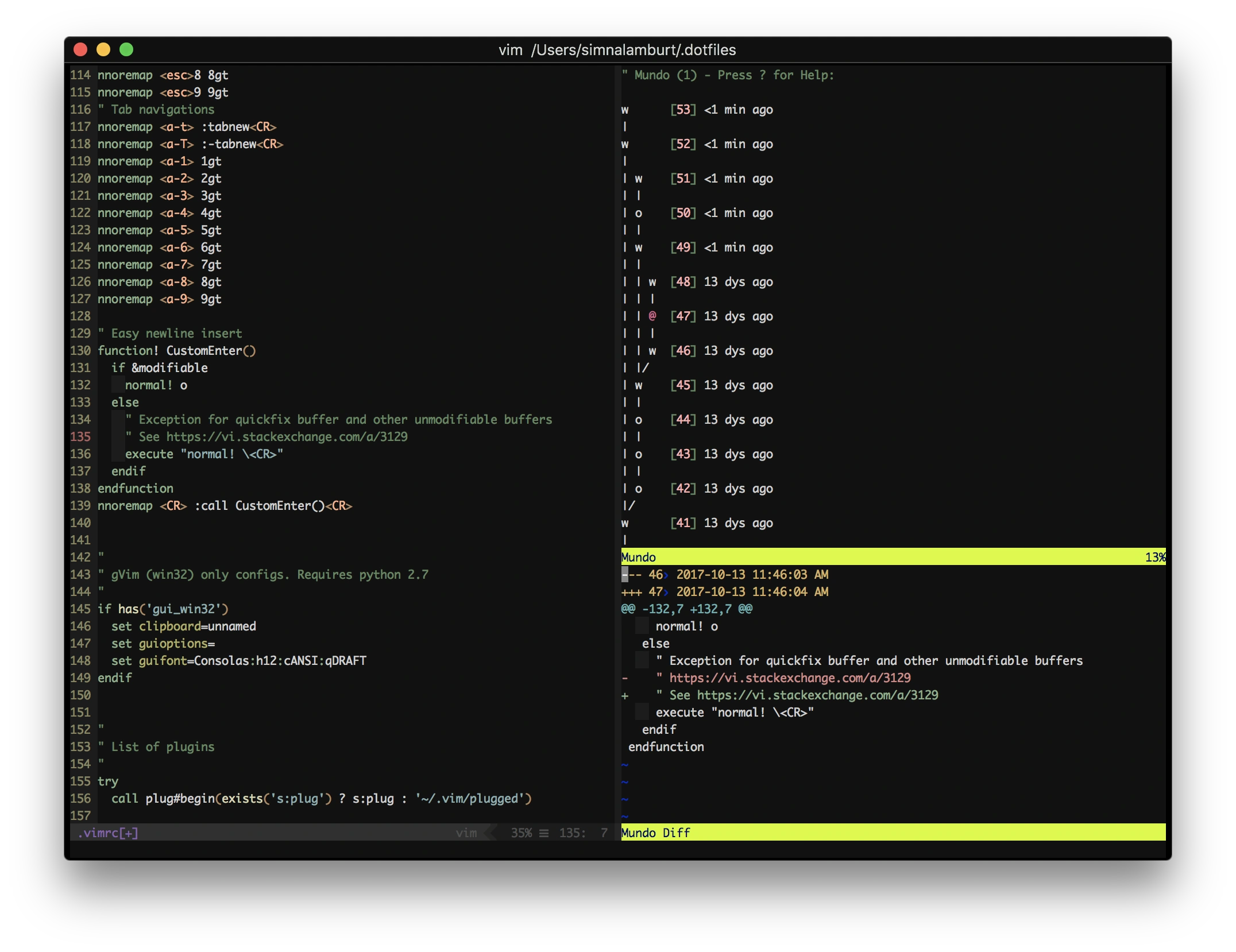 Additionally, you can tag certain states using T on the item. If you press D, a diff window is shown allowing you to review all changes that have been made between your current state and the selected state. And as some kind of funny feature, you can even let Vim replay the changes that have been made from the beginning.